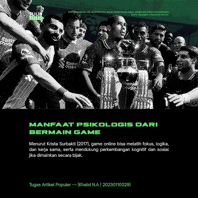 Dari sudut pandang psikologi, bermain game ternyata tidak selalu berdampak negatif. Krista Surbakti dalam Jurnal Curere (2017) menjelaskan bahwa game online dapat memberikan manfaat bagi remaja, khususnya dalam mengembangkan kemampuan kognitif dan sosial. Aktivitas bermain game dapat melatih fokus, konsentrasi, serta keterampilan memecahkan masalah. Selain itu, interaksi yang terjadi dalam game daring juga mampu mendorong perkembangan keterampilan komunikasi dan kerja sama. Dengan kata lain, selama dimainkan secara proporsional, game dapat menjadi sarana pembelajaran yang mendukung pertumbuhan mental dan emosional pemainnya.