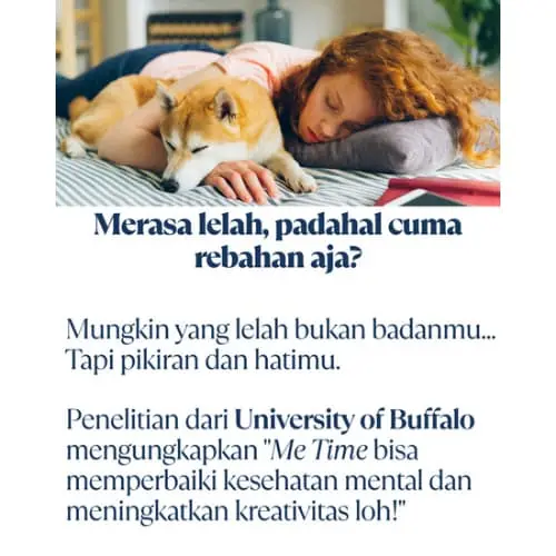 Bisa jadi yang lelah bukan tubuhmu, tapi pikiran dan perasaanmu. Penelitian dari University of Buffalo mengungkapkan bahwa meluangkan waktu untuk diri sendiri atau yang sering disebut me time, bisa memperbaiki kesehatan mental dan meningkatkan kreativitas. Dalam studi tersebut, mereka yang memberi waktu untuk dirinya sendiri terbukti lebih kreatif dibandingkan yang tidak. Ini membuktikan bahwa kita semua butuh waktu untuk rehat, jauh dari hiruk-pikuk kehidupan sehari-hari, agar bisa kembali memberi ruang pada diri sendiri.