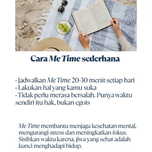 Di zaman serba cepat seperti sekarang, me time bukan cuma soal santai-santai manja. Ini soal menjaga pikiran tetap jernih, hati tetap tenang, dan hidup tetap terasa punya warna. Kalau terus-terusan sibuk tanpa jeda, yang ada malah cepat setres dan kehilangan energi untuk menikmati hal-hal yang kita sukai.