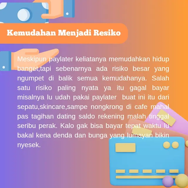 Meskipun paylater keliatanya memudahkan hidup banget,tapi sebenarnya ada risiko besar yang ngumpet di balik semua kemudahanya. Salah satu risiko paling nyata ya itu gagal bayar misalnya lu udah pakai paylater buat ini itu dari sepatu,skincare,sampe nongkrong di cafe