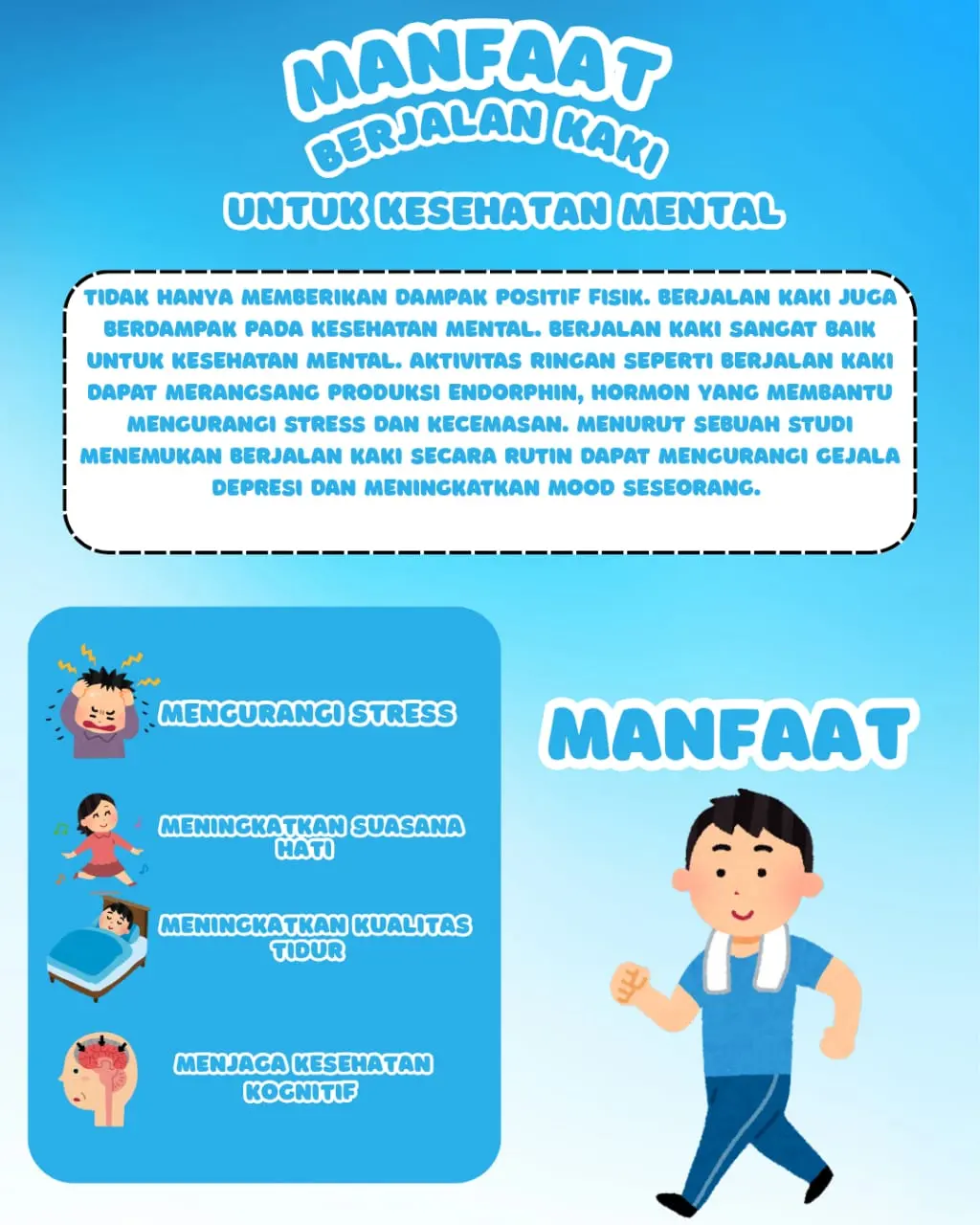 fisik. Berjalan kaki juga berdampak pada kesehatan mental. Dilansir dari blog